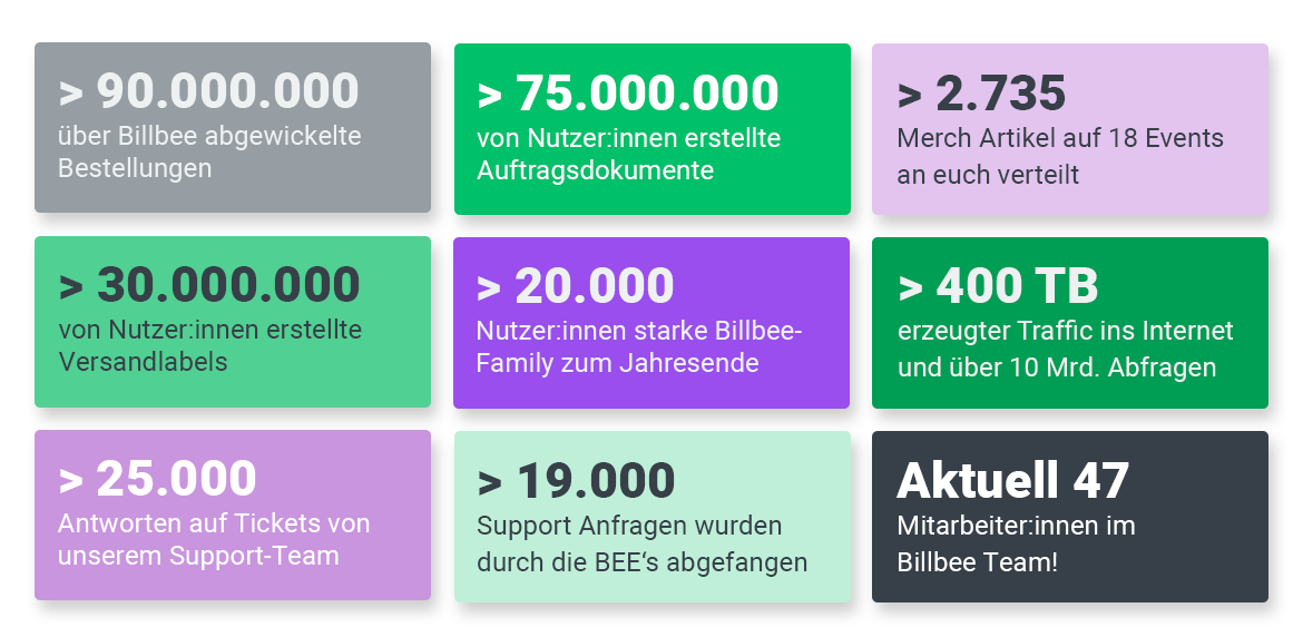 Außerdem waren wir in diesem Jahr viel unterwegs - auf ganzen 18 Events und Messen rund um E-Commerce und Multichannel! Dort haben wir tollen Input bekommen, coole Händler:innen kennengelernt und 2735 Merch Artikel verteilt. Na, wer von euch konnte unseren begehrten Honig oder die stylischen Billbee Socken ergattern? Auch das geht nur mit viel (Wo)man-Power! Deswegen sind wir auch sehr stolz, dass wir in diesem Jahr 782 Bewerbungen bekommen haben und fünf neue Kolleg:innen unser Team bereichern. Somit starten wir mit 47 Mitarbeiter:innen und voller Tatendrang in das neue Jahr! Du möchtest auch Teil von Billbee werden? Dann schau doch mal auf unserer Karriereseite vorbei.