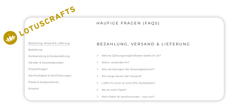 Richte dafür eine eigene Seite ein, auf der du die wichtigsten Fragen deiner Kund:innen beantwortest. Hierzu gehören Fragen zu deinem Unternehmen, zu deinen Produkten, zu Versand, Lieferung und Retoure oder auch zu den Zahlungsmethoden. Alles, was eben wichtig ist, um Kund:innen vom Kauf bei dir zu überzeugen.